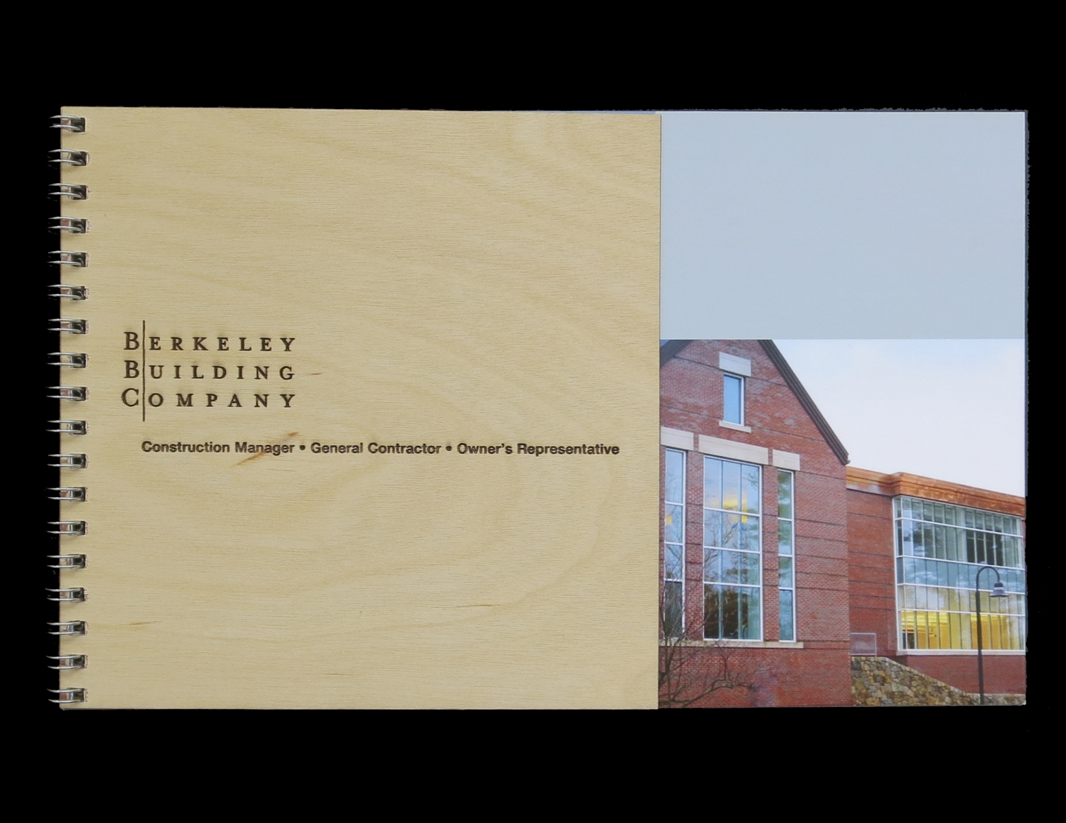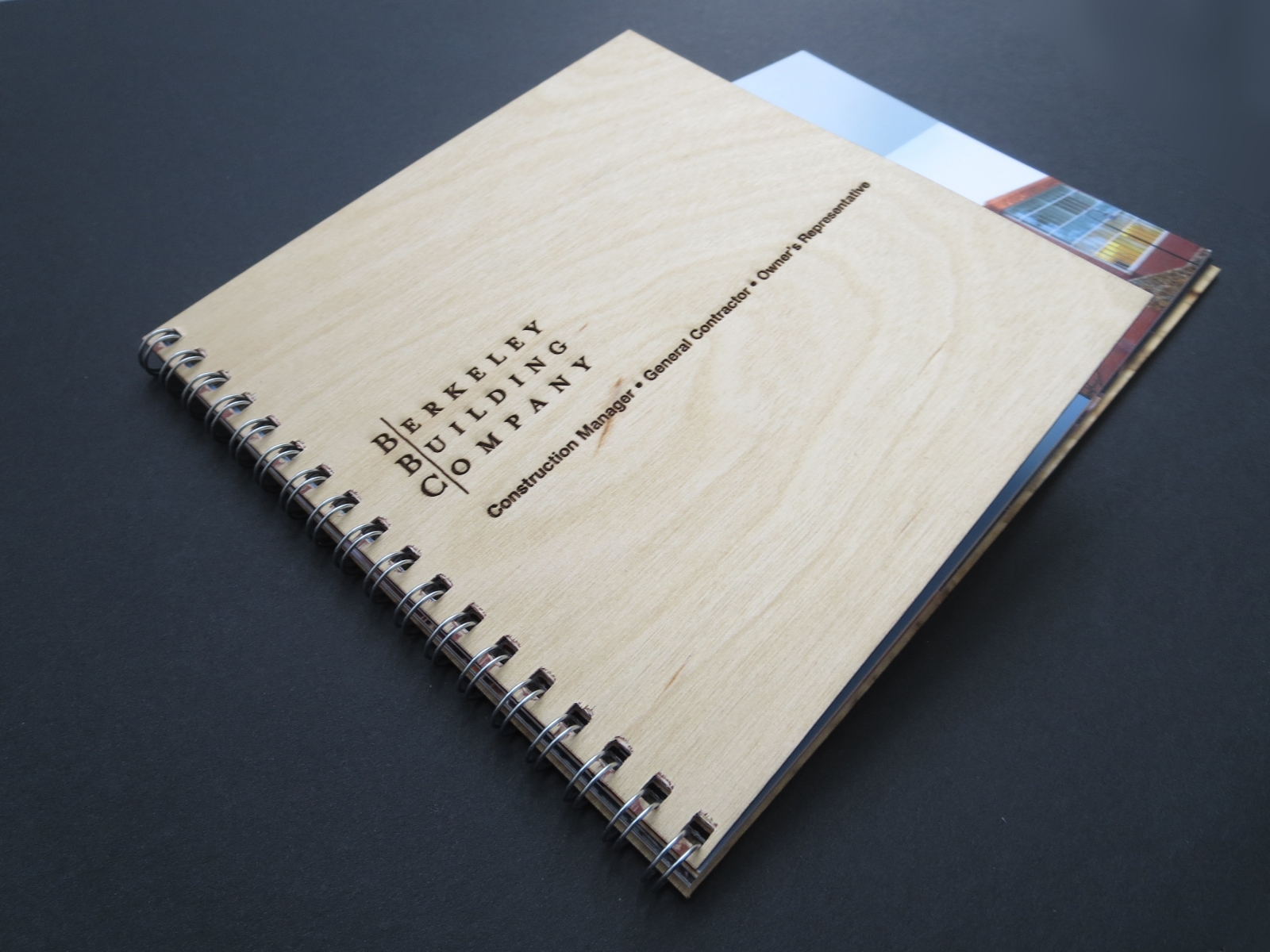 The laser etched wood cover on this corporate brochure provides a distinctive introduction to the firm.