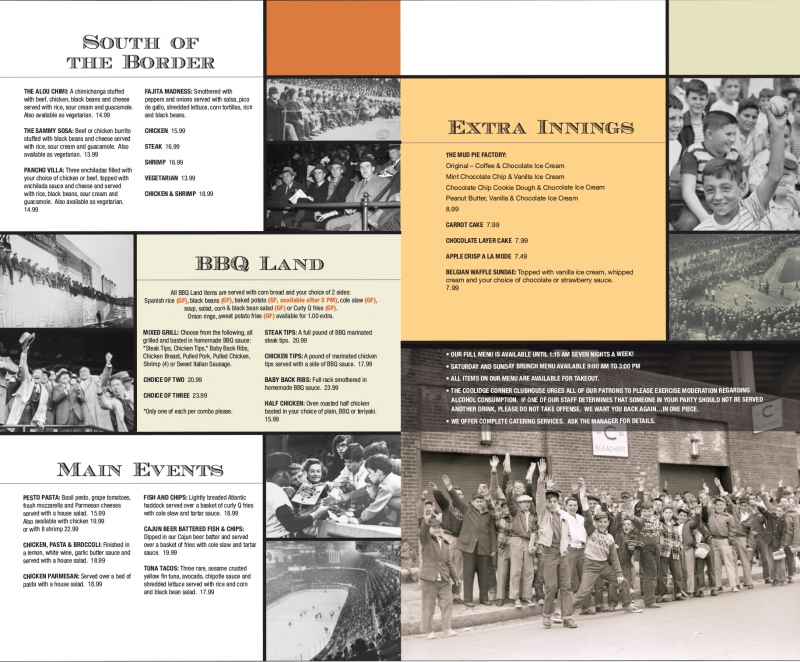 The CCC is a popular sports bar in Coolidge corner. The menu features archival images of some of Boston's passionate fans and sports venues.