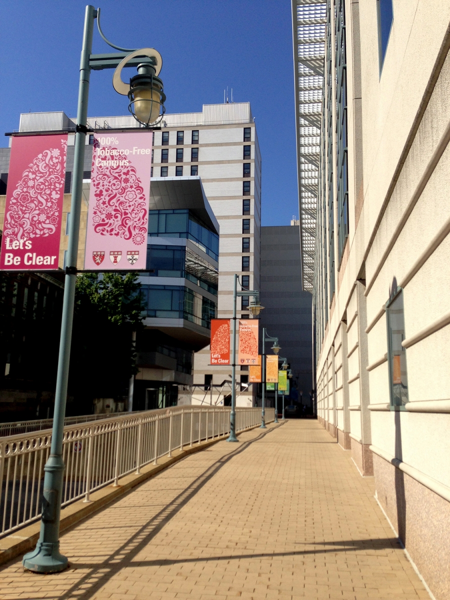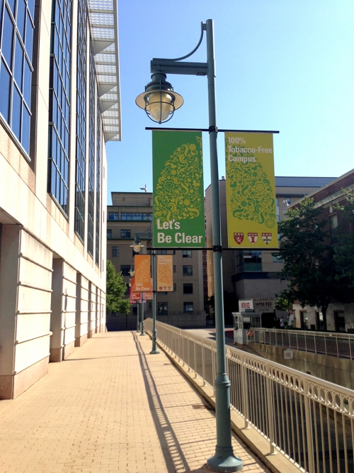 Harvard Medical School needed an awareness campaign to mitigate a problem of public smoking on campus. The theme "Let's Be Clear" was created to promote the importance of a smoke-free environment and to highlight the risk smoke poses to contaminating lab spaces. The campaign includes a series of stylized images of lungs on colorful banners located on buildings and free-standing stanchions in problem areas.
