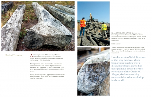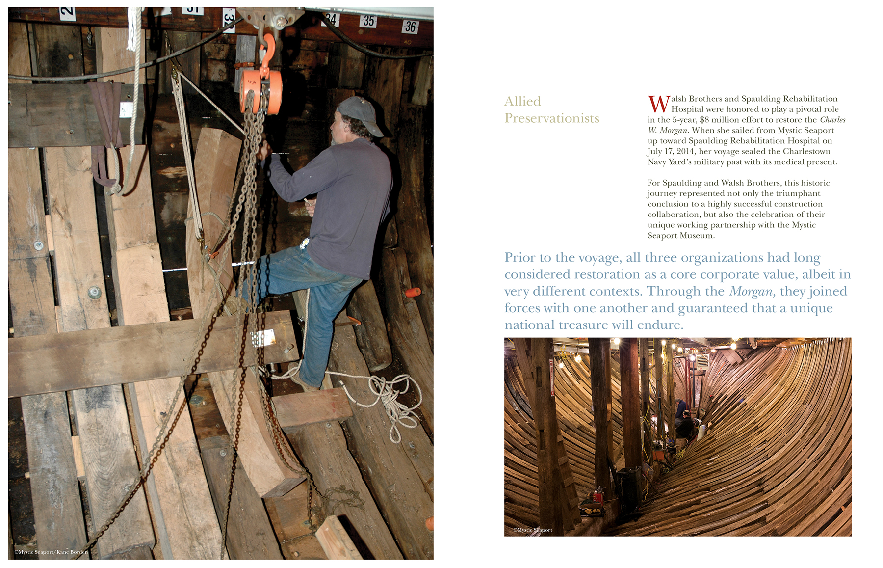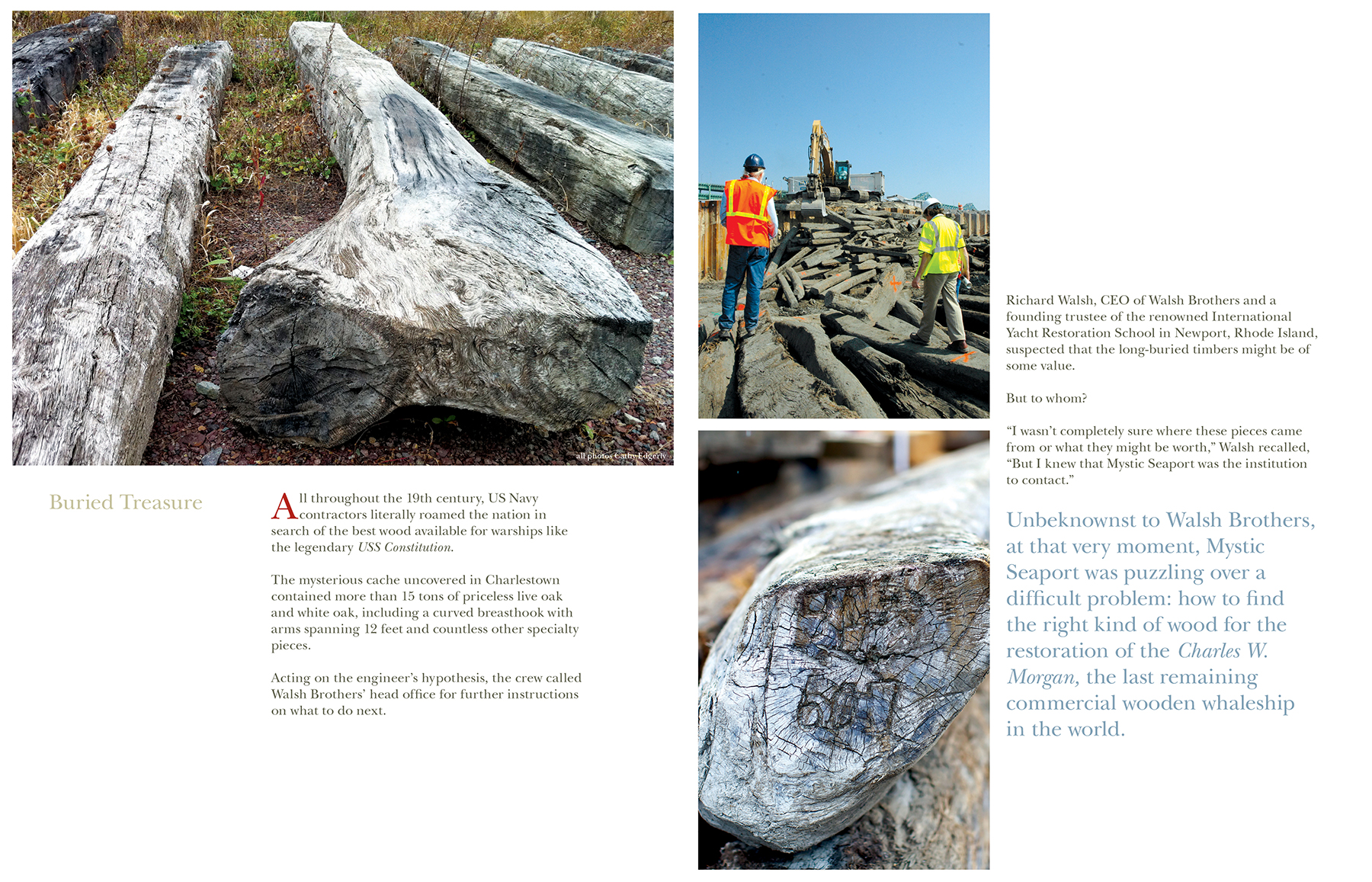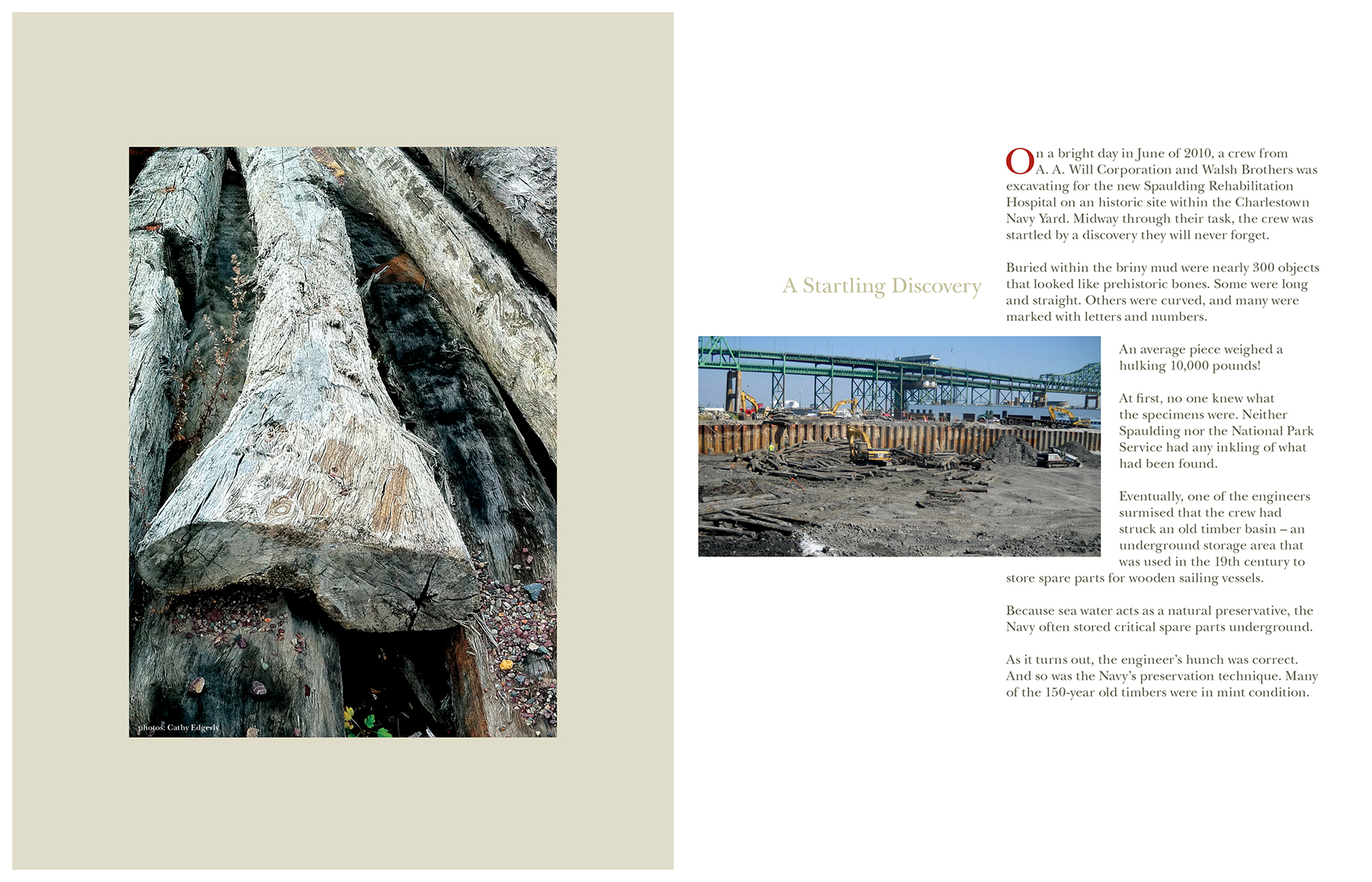 As Walsh Brothers began construction on the new Spaulding Rehab building on the site of the old Charlestown Navy Yard, some unusual wood timbers were uncovered. It was noted that they had numbers carved in them and this raised questions as to what they could be. An expert from Mystic Seaport in Connecticut was consulted and it was determined these were timbers used in shipbuilding that had been preserved in the mud. By coincidence, America's oldest whaling vessel was in the process of being restored in the drydock in Mystic Seaport and these timbers were exactly what was needed to complete the task.