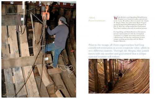 Walsh Brothers documented this story in a book that shows the timbers as they were discovered and how they were integrated into the restoration process. When the restoration was completed in the summer of 2014, the ship sailed up to Boston Harbor and Spaulding Rehab to pay tribute to those who had hel[ped provide the valuable material for its restoration.